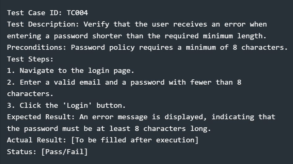 Prompt: “Generate a test case for the login feature when the user enters a password shorter than the required minimum length.”