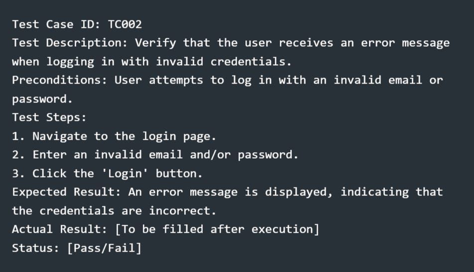 Prompt: “Generate a test case for the login feature when the user enters incorrect credentials.”