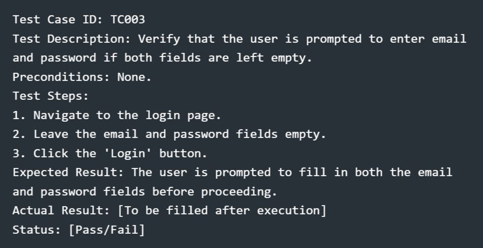 Prompt: “Generate a test case for the login feature when the user leaves the email and password fields empty.”
