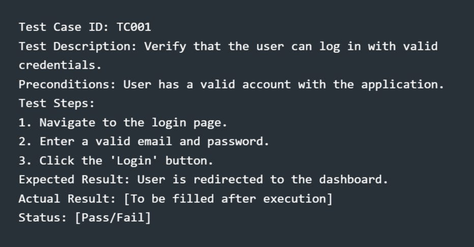 Prompt: “Generate a test case for the login feature when the user enters correct credentials.”
