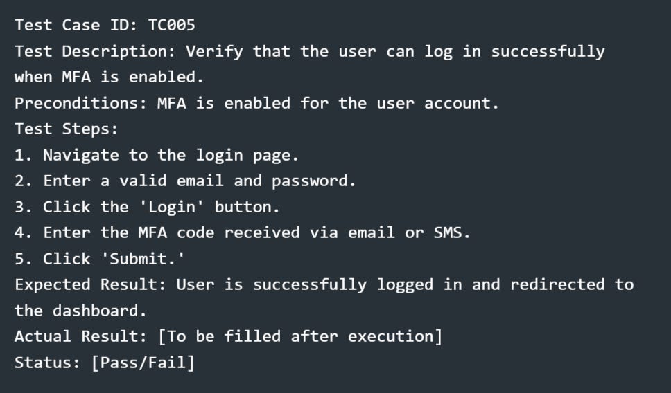 Prompt: “Generate a test case for the login feature when multi-factor authentication (MFA) is enabled.”